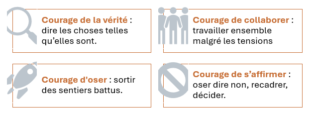Ces types de courage sont interconnectés. La vérité servira de socle pour construire la collaboration, qui elle-même ouvre la voie à l’innovation et aux actes « oser ! ». L’agrégation du tout renforce un management plus humain et performant, tant au niveau individuel que collectif.